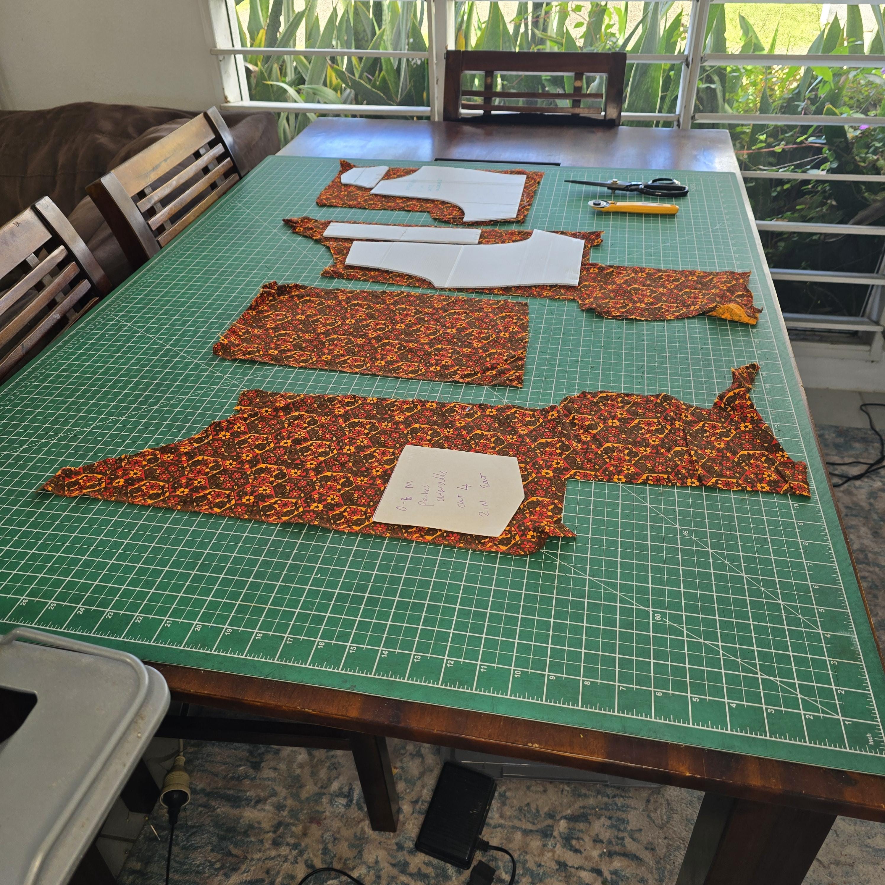 Cutting out patterns from scraps.
