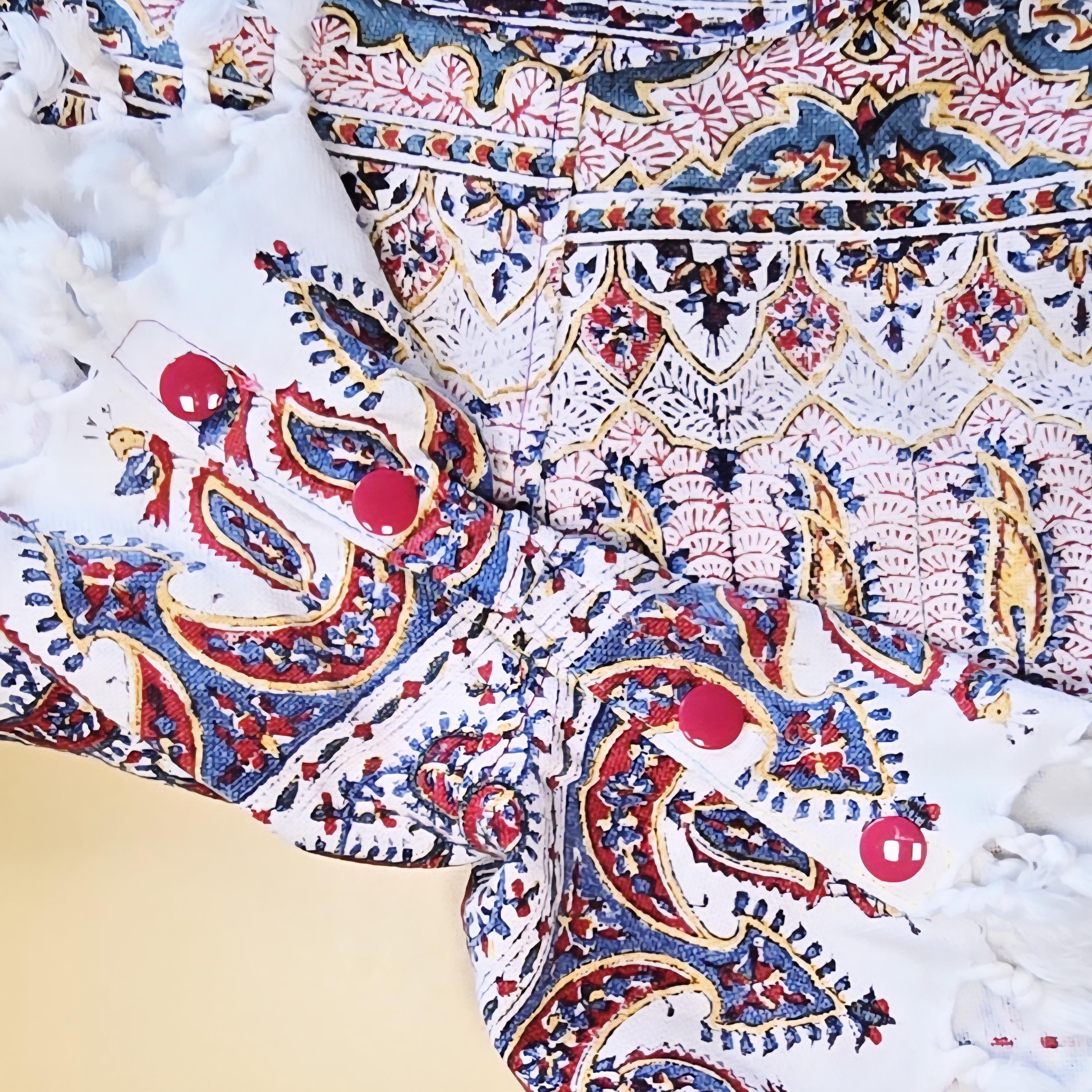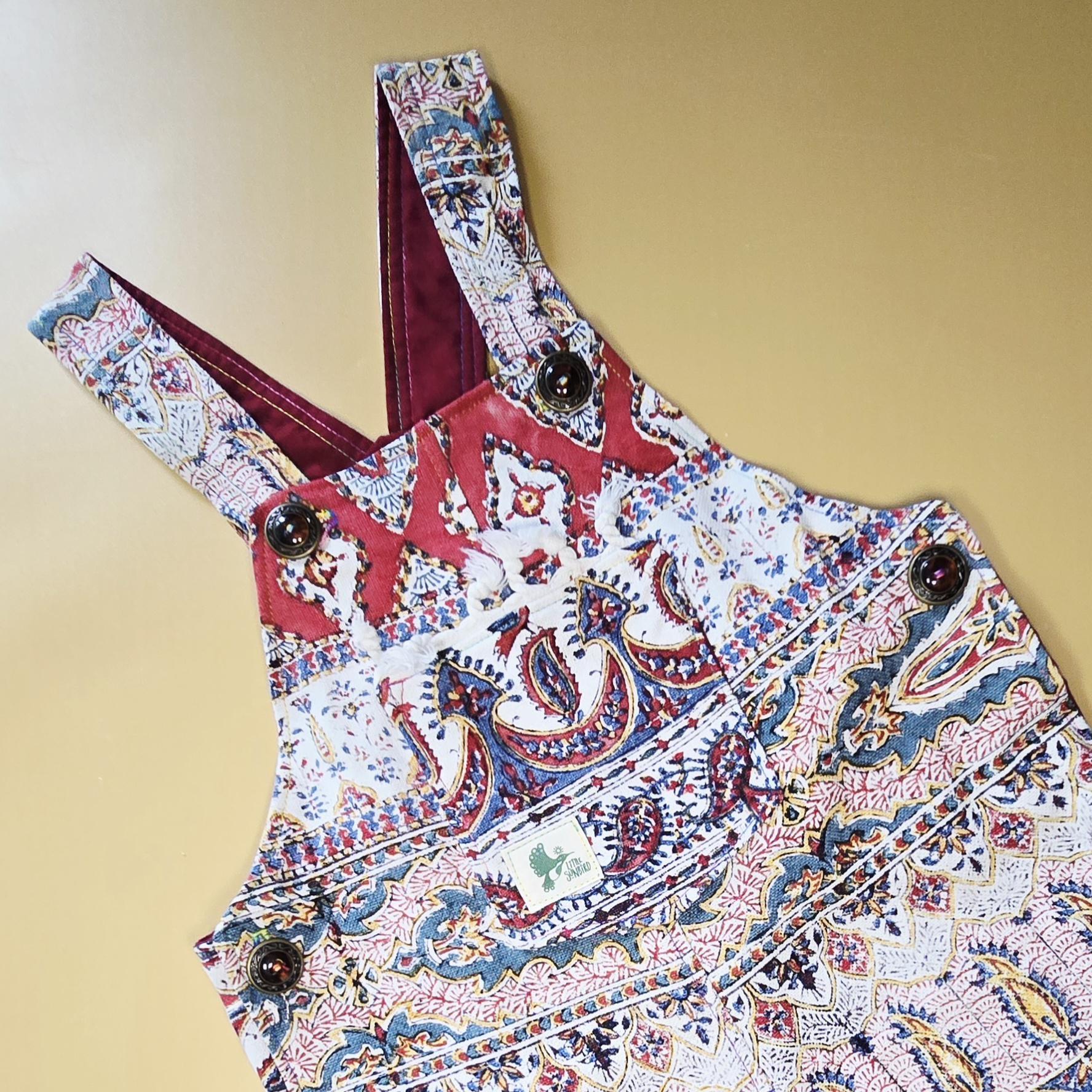 These adorable overalls are perfect for your little one. They are made with an upcycled cotton rug. They feature convenient snaps for quick changes and tassles for something a bit extra!
