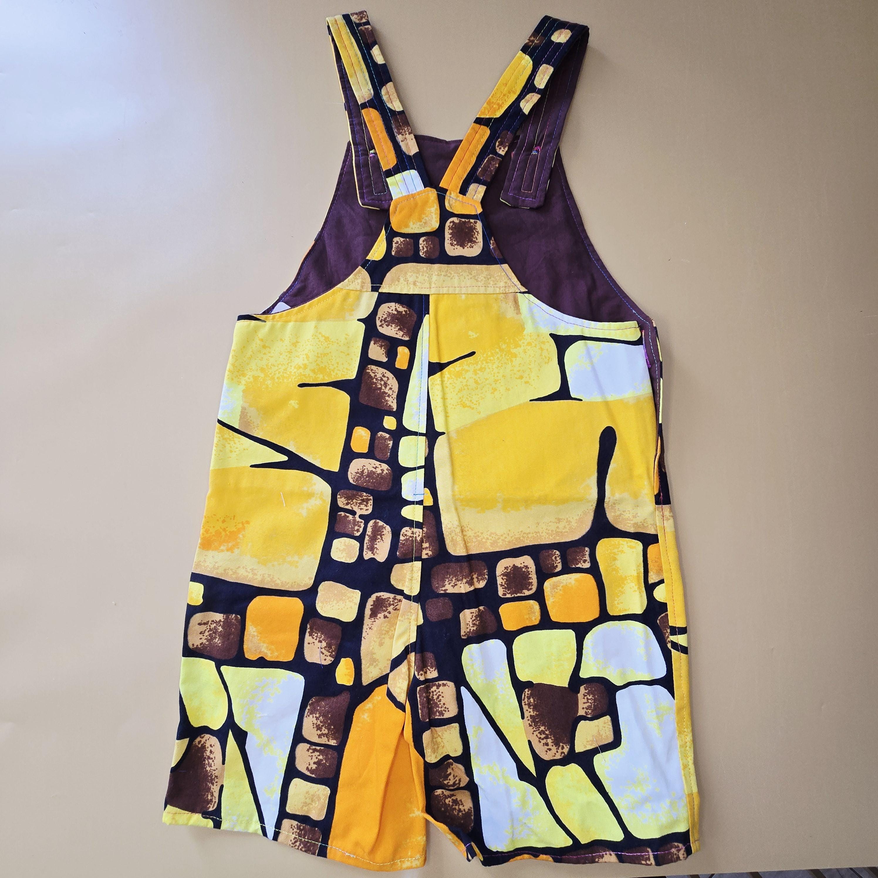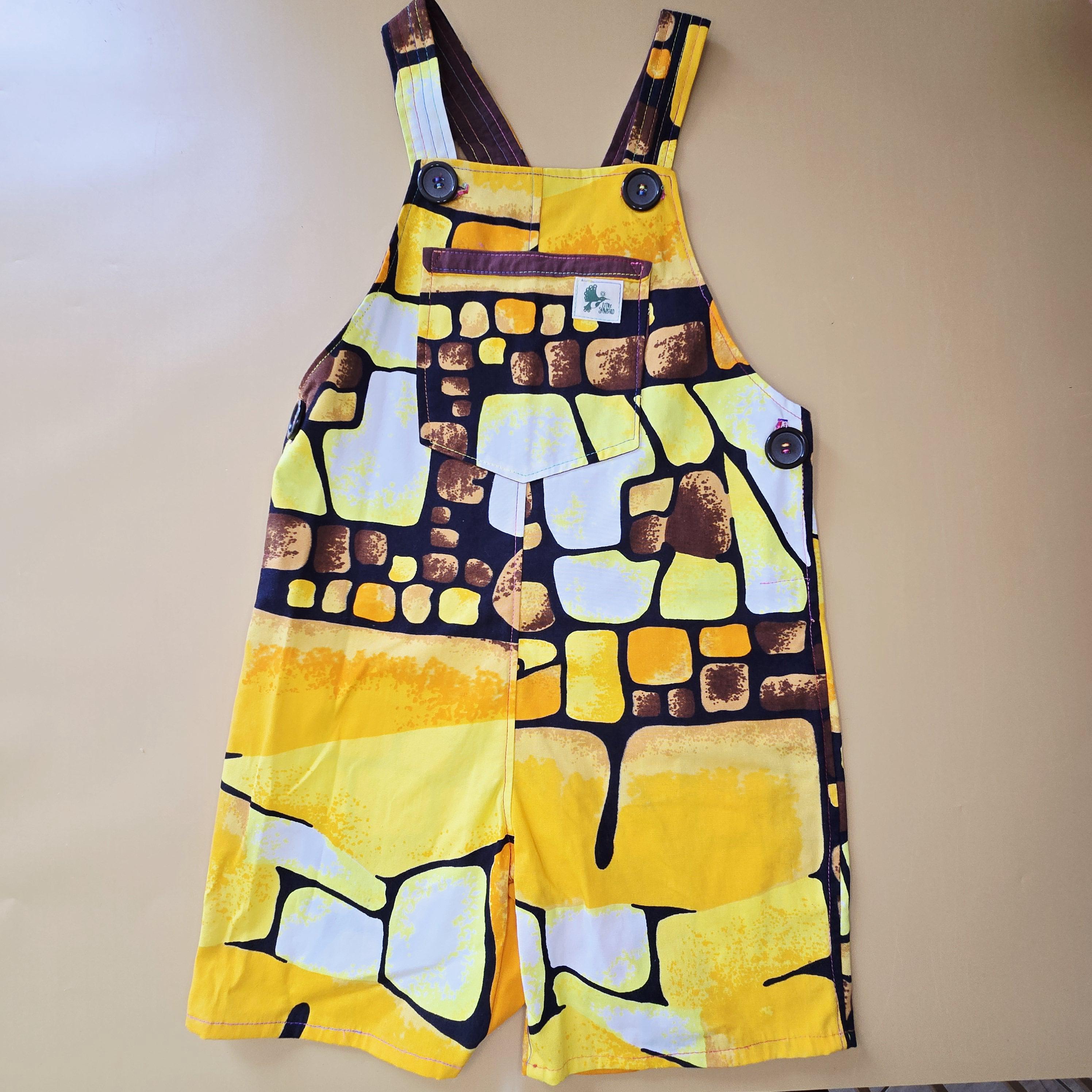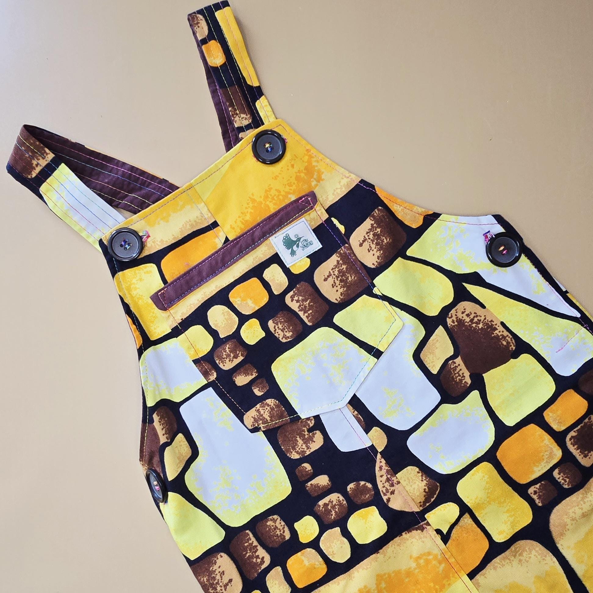 Size 4 year overalls, hand made in australia using a great quality vintage retro print cotton remnant.