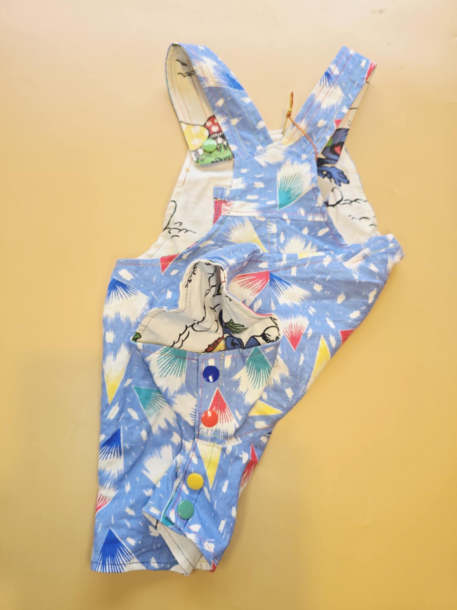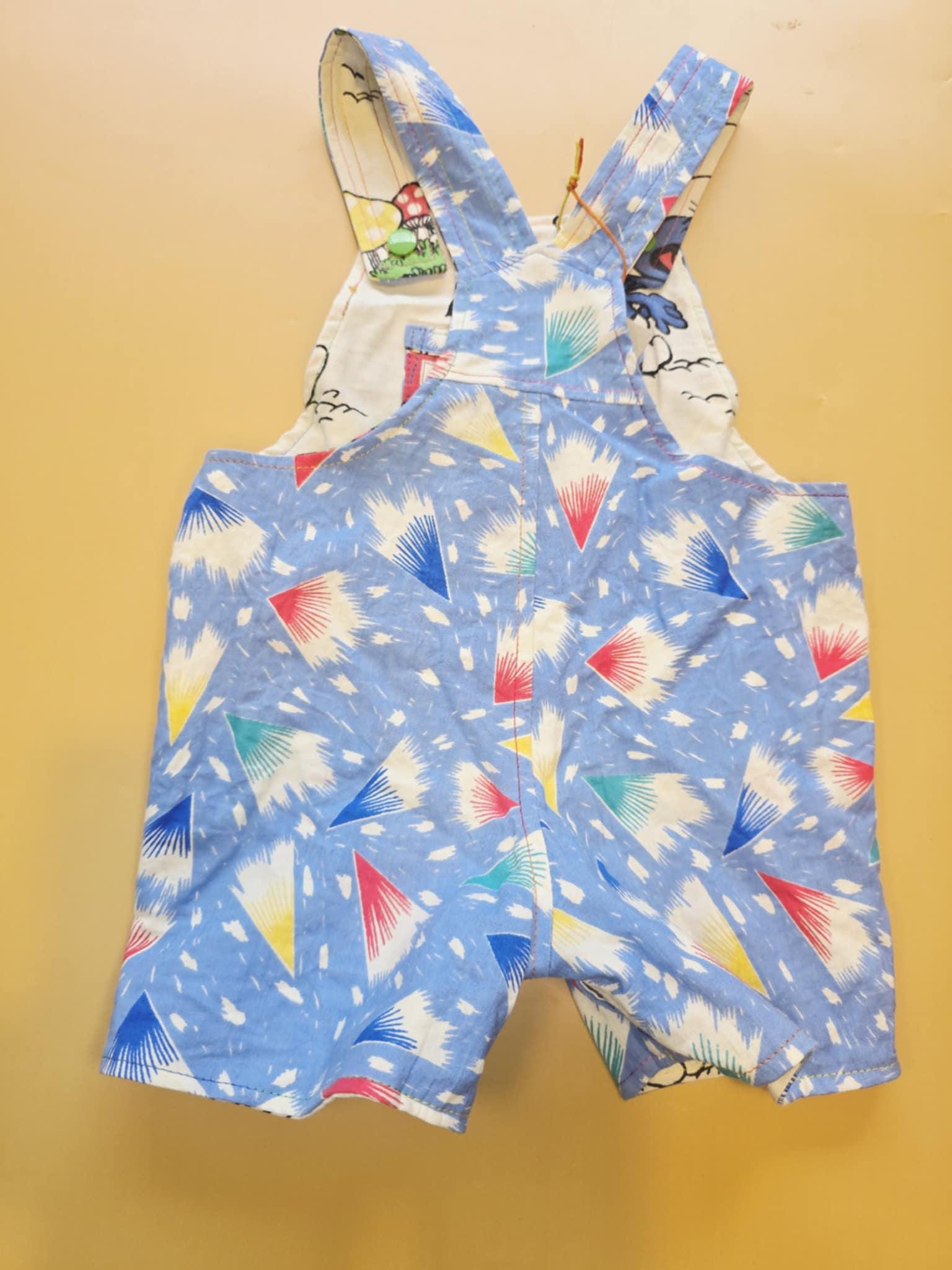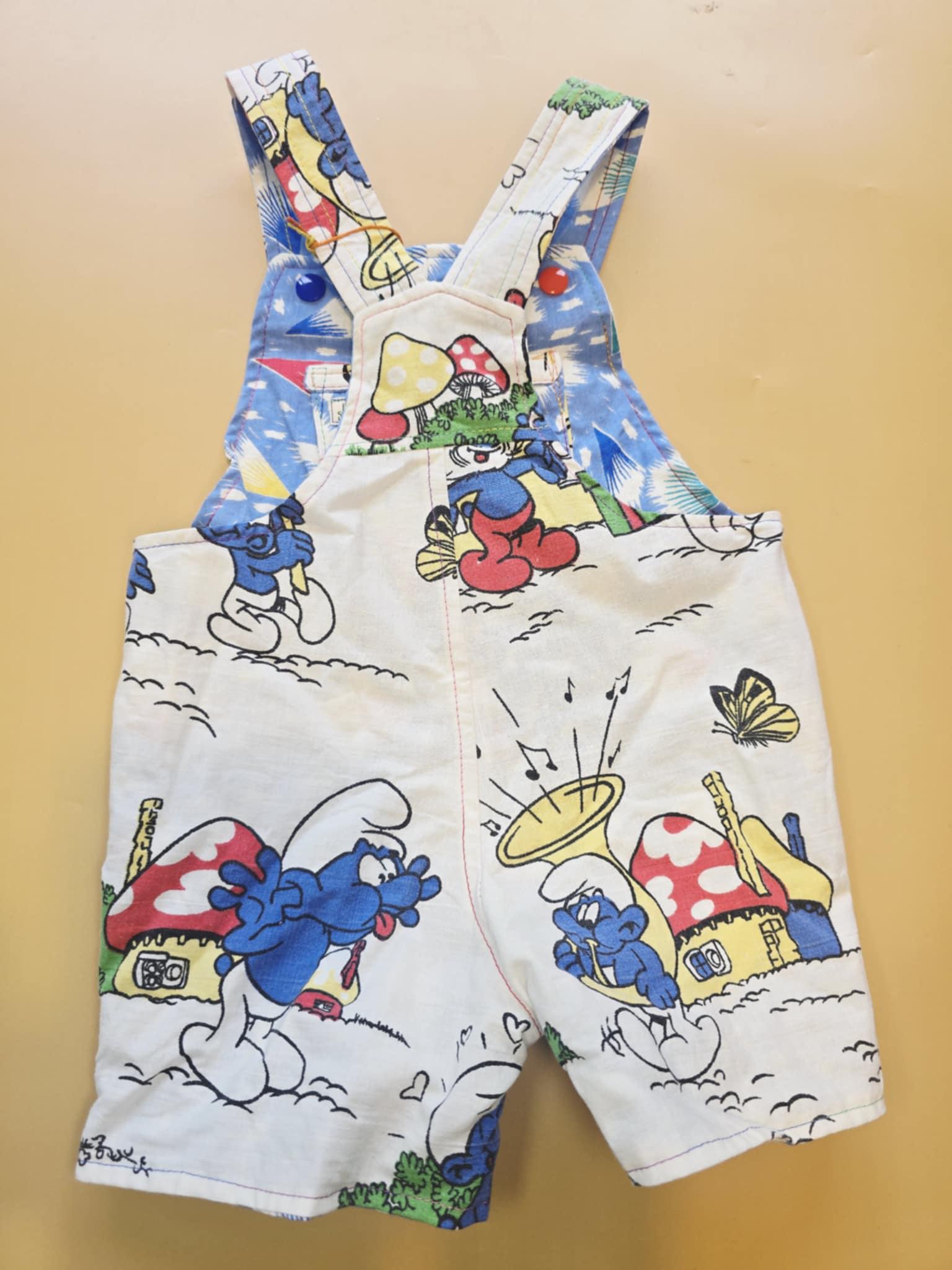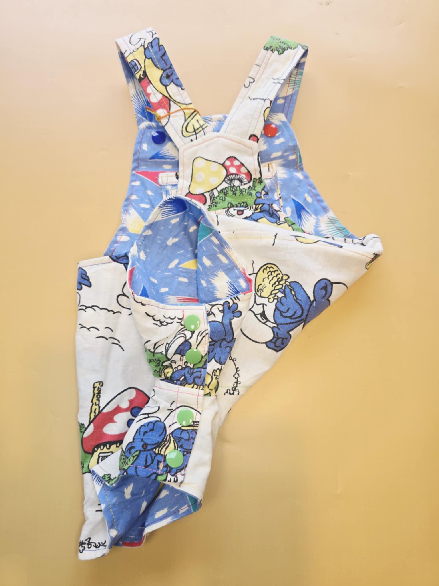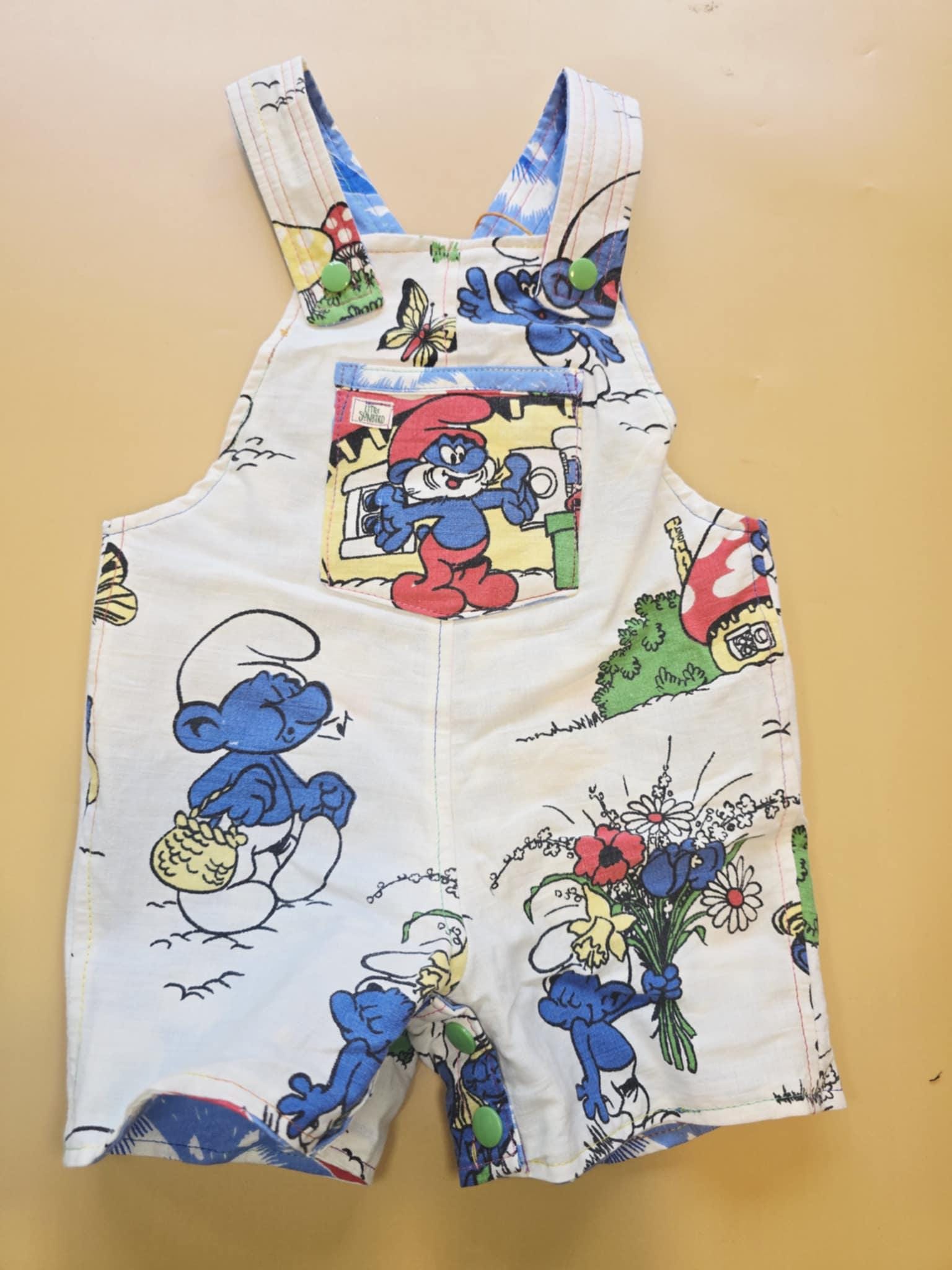 3M 121- Reversible baby Overalls - upcycled vintage smurfs pillowcase and vintage cotton sheet