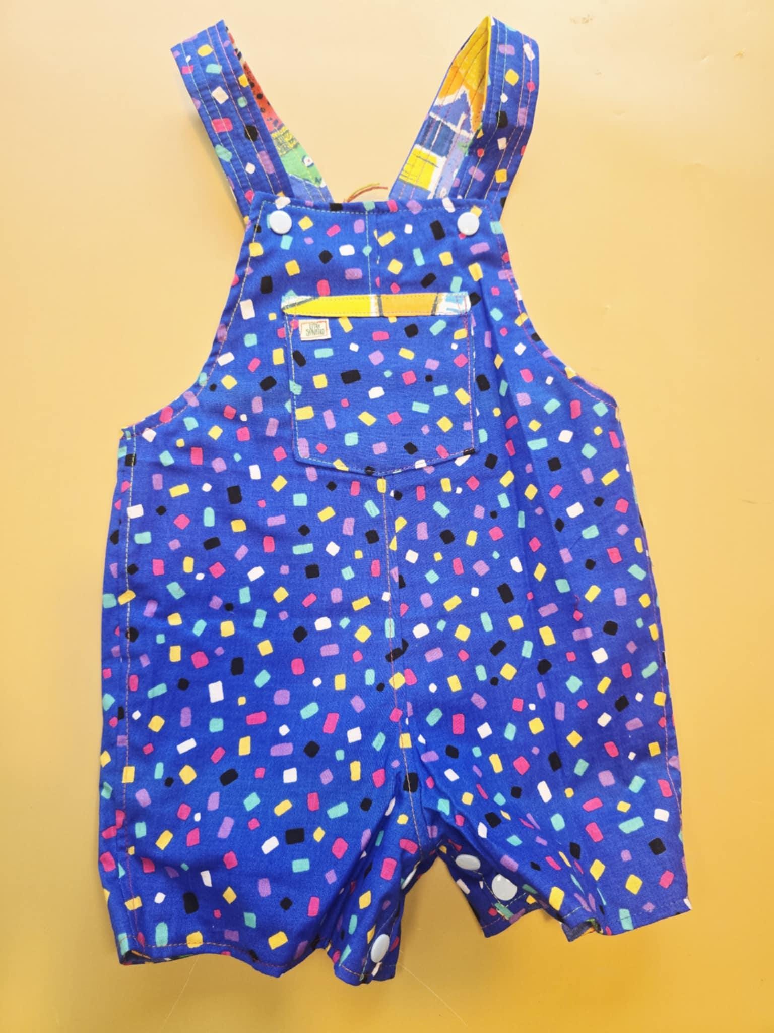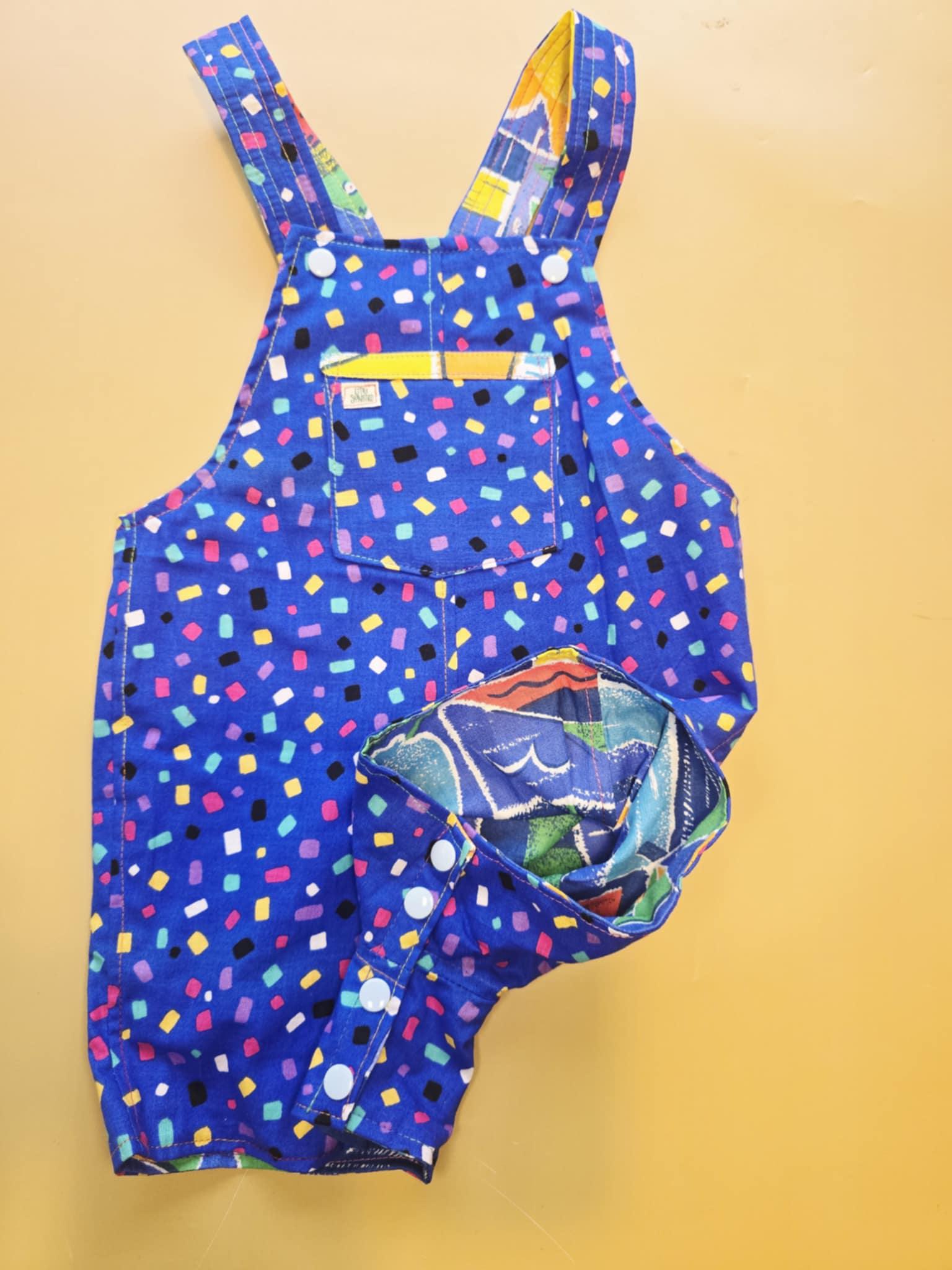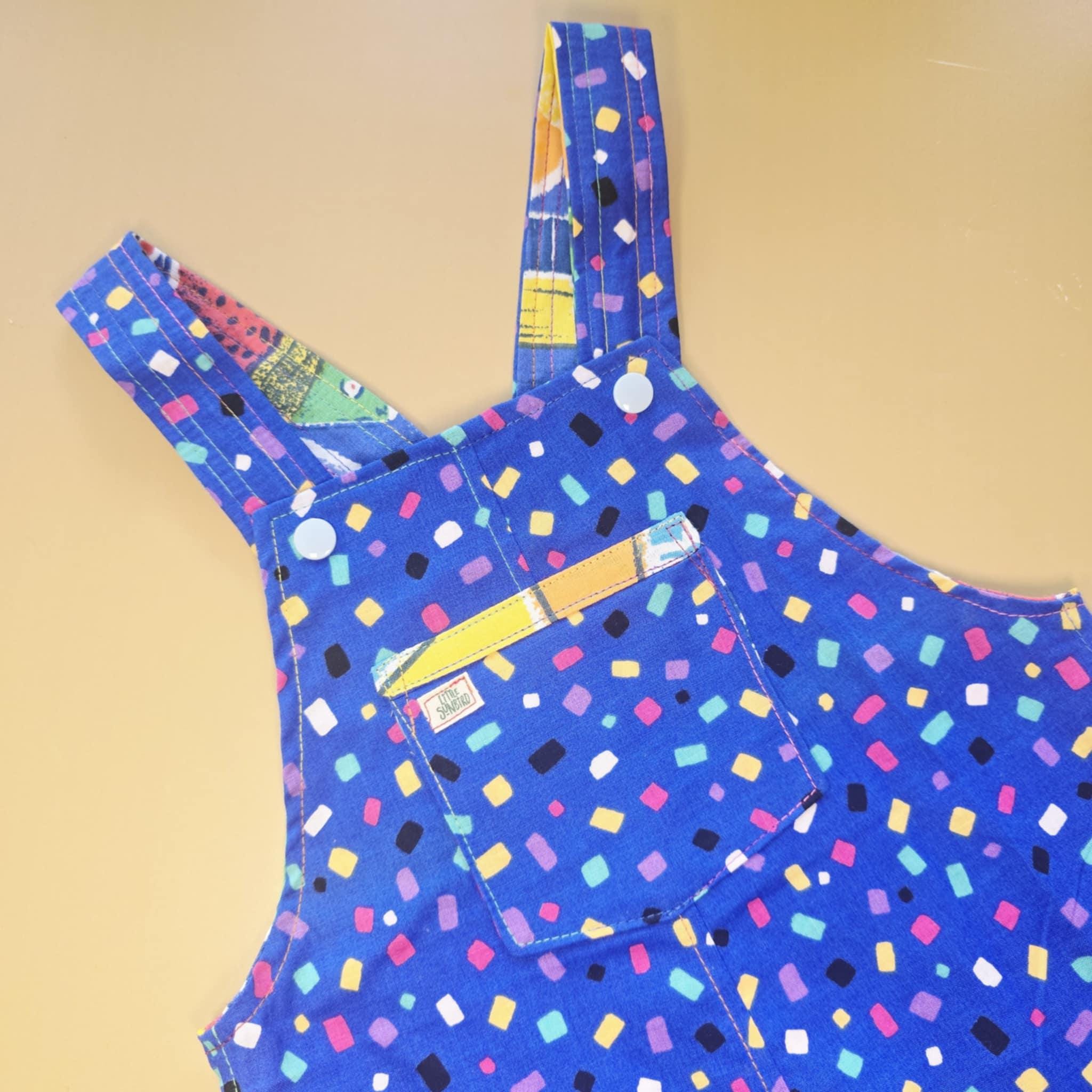 Shoulder straps with snaps, a front pocket, and nappy snaps for quick changes. Handmade for comfort, character, and a wink of absurdity.