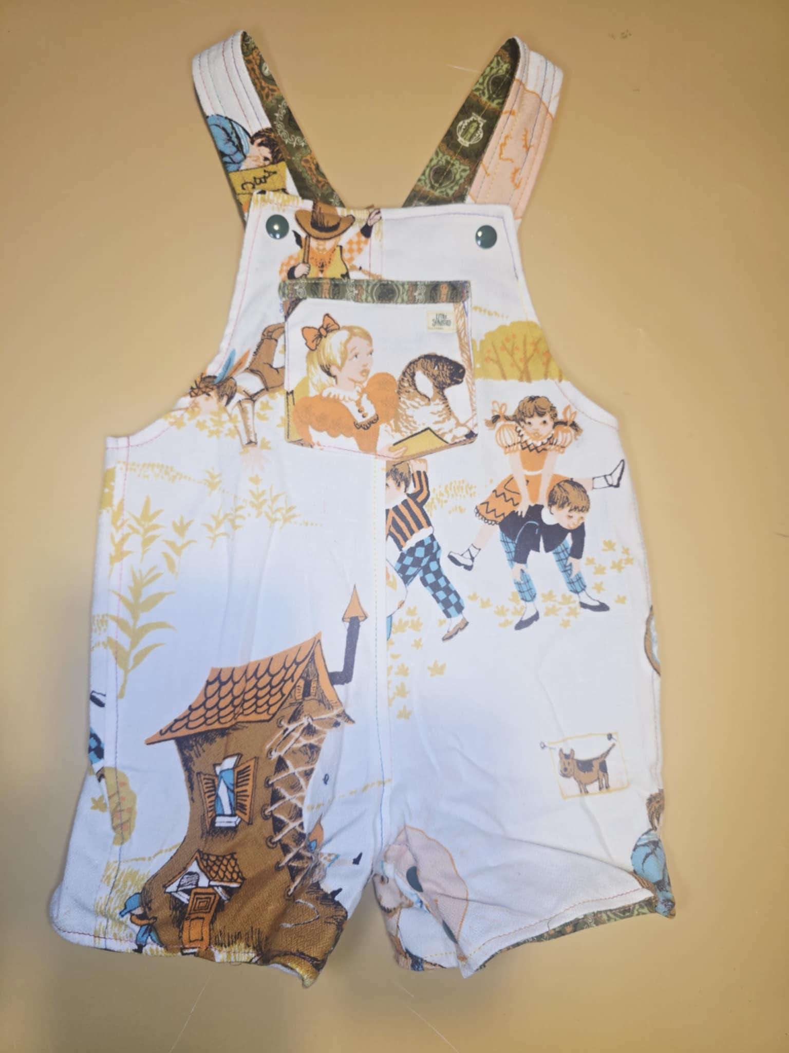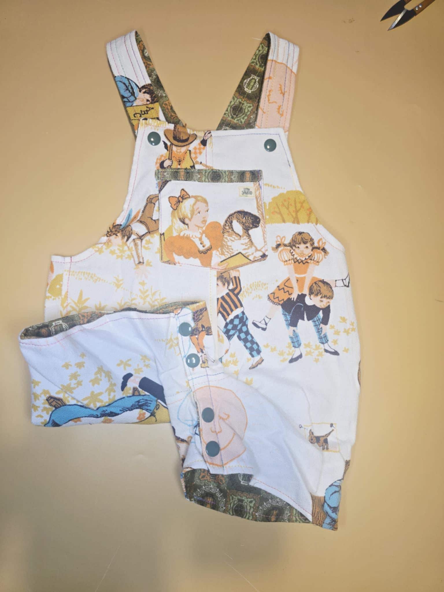 One sides features bold an upcycled vintage cotton sheet with a nursery rhyme theme.