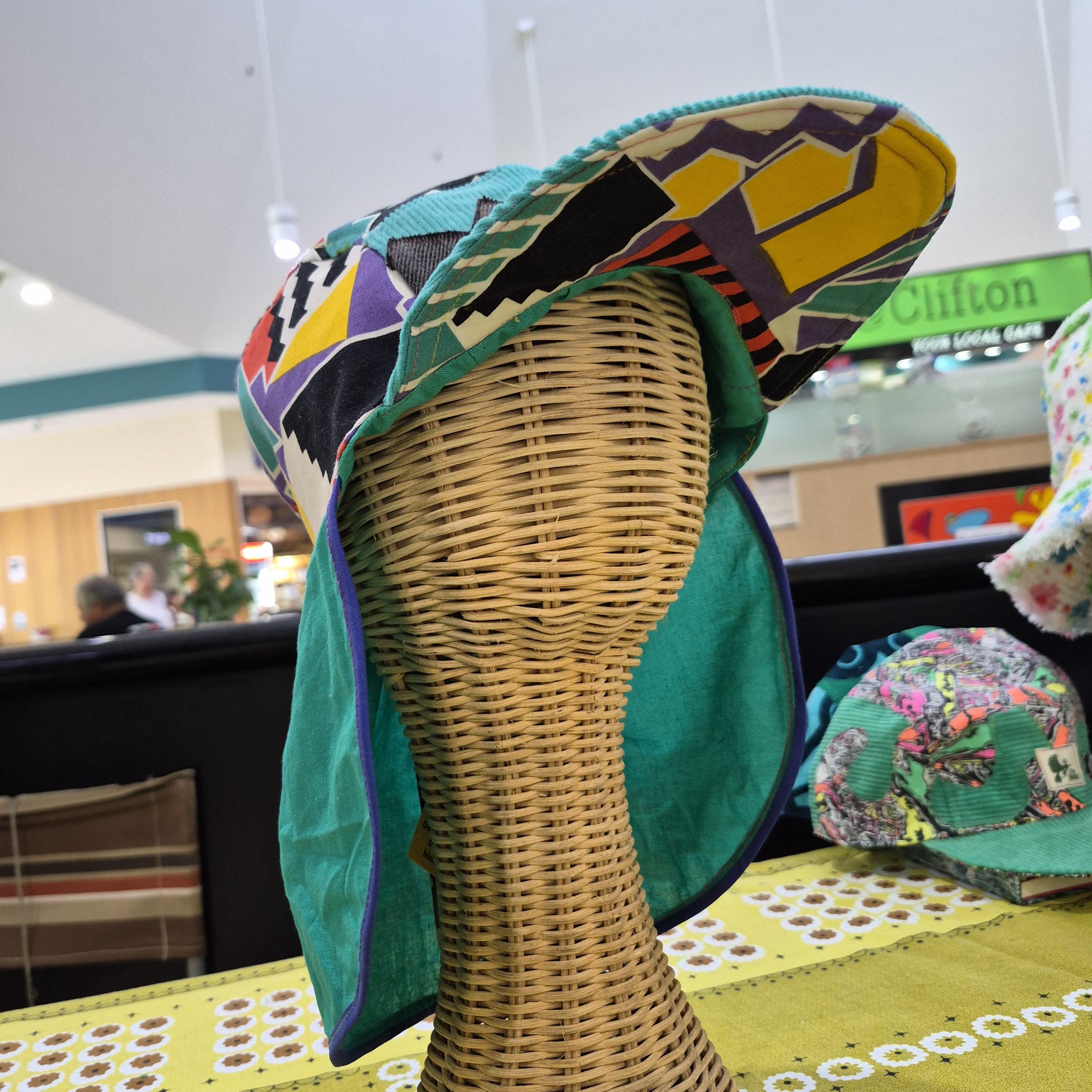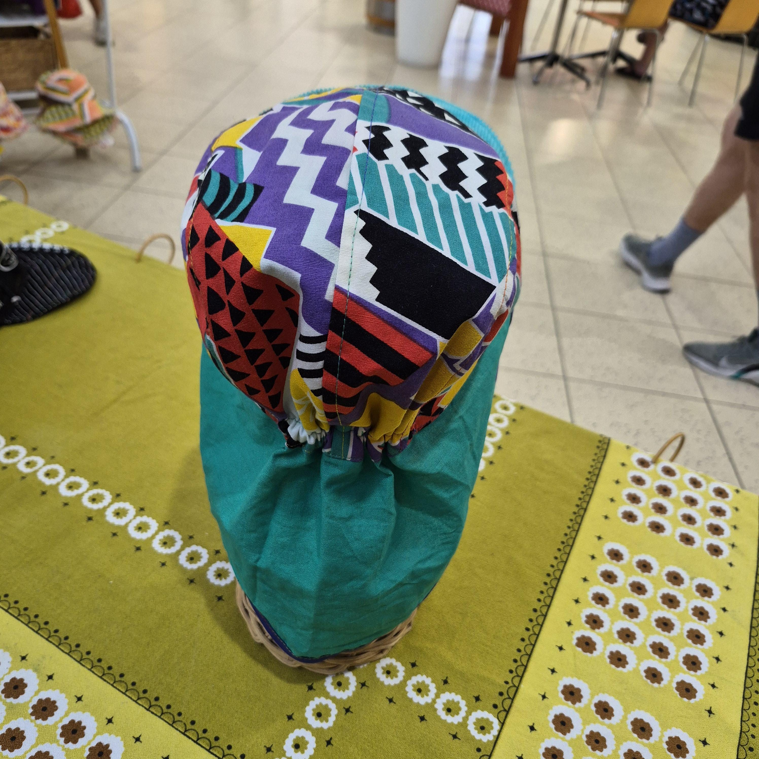 We would be delighted to offer a unique, handmade hat for your consideration. This charming piece is crafted from a beautiful bright vintage cotton, offering a distinctive texture and appeal, with flap for sun protection. It is designed to fit a range of sizes, from 52cm to 58cm, with an elasticated band for comfortable wear. This versatile size makes it suitable for either a large child or tween. We believe it would be a delightful addition to any collection.