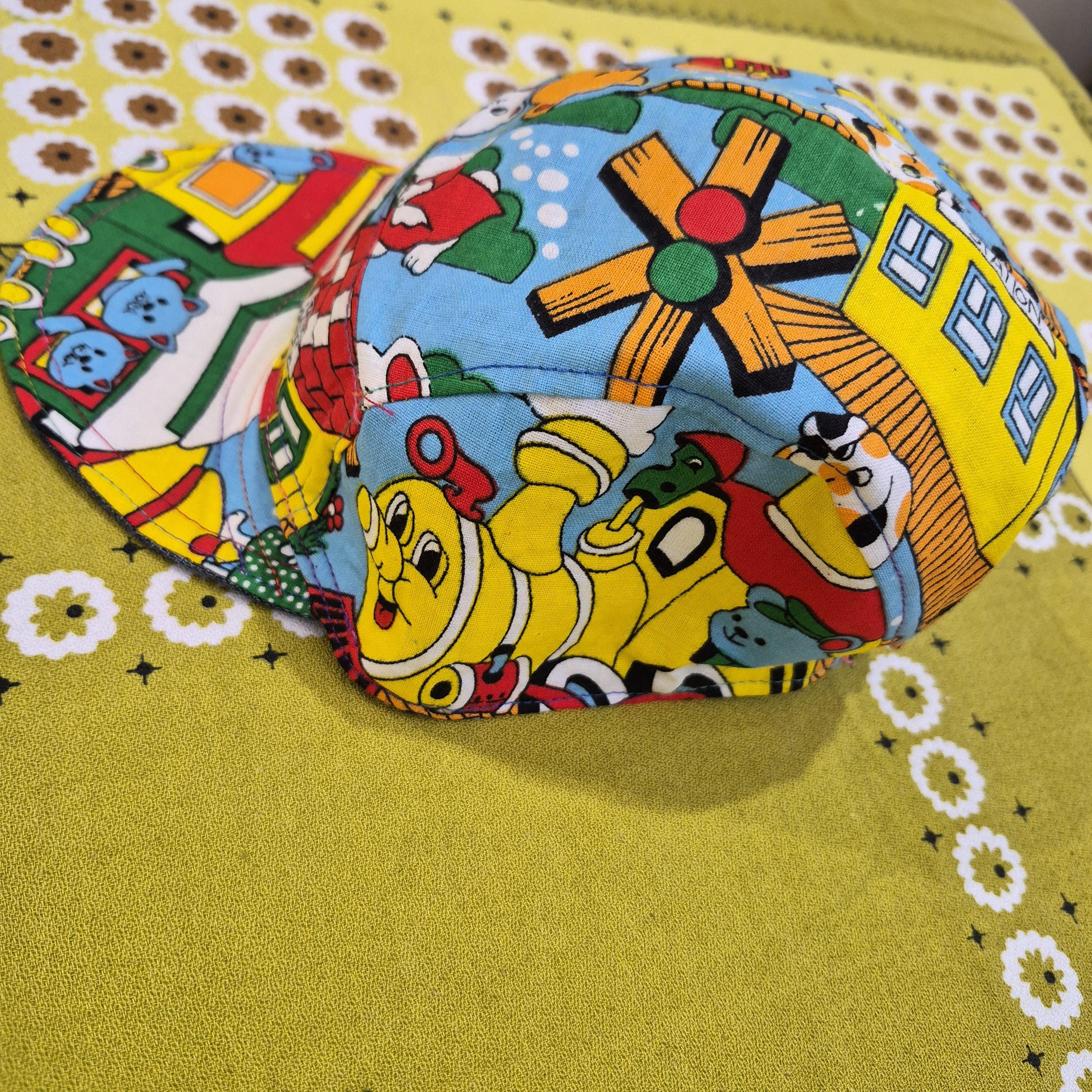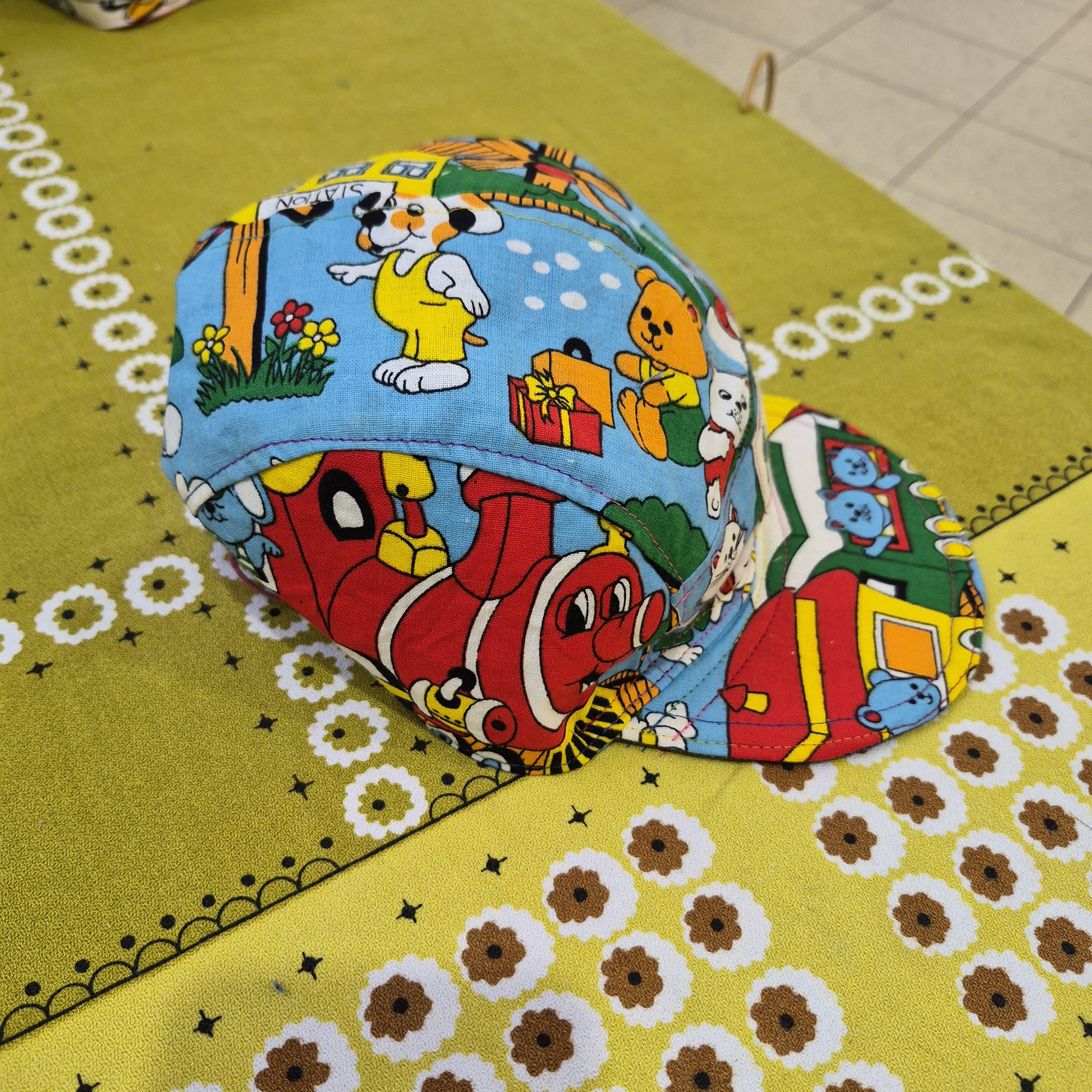 We would be delighted to offer a unique, handmade hat for your consideration. This charming piece is crafted from a beautiful bright vintage cotton featuring a cute trains and animal pattern, offering a distinctive texture and appeal. It is designed to fit a range of sizes, from 49cm to 55cm, with an elasticated band for comfortable wear. This versatile size makes it suitable for either a large child or tween. We believe it would be a delightful addition to any collection.