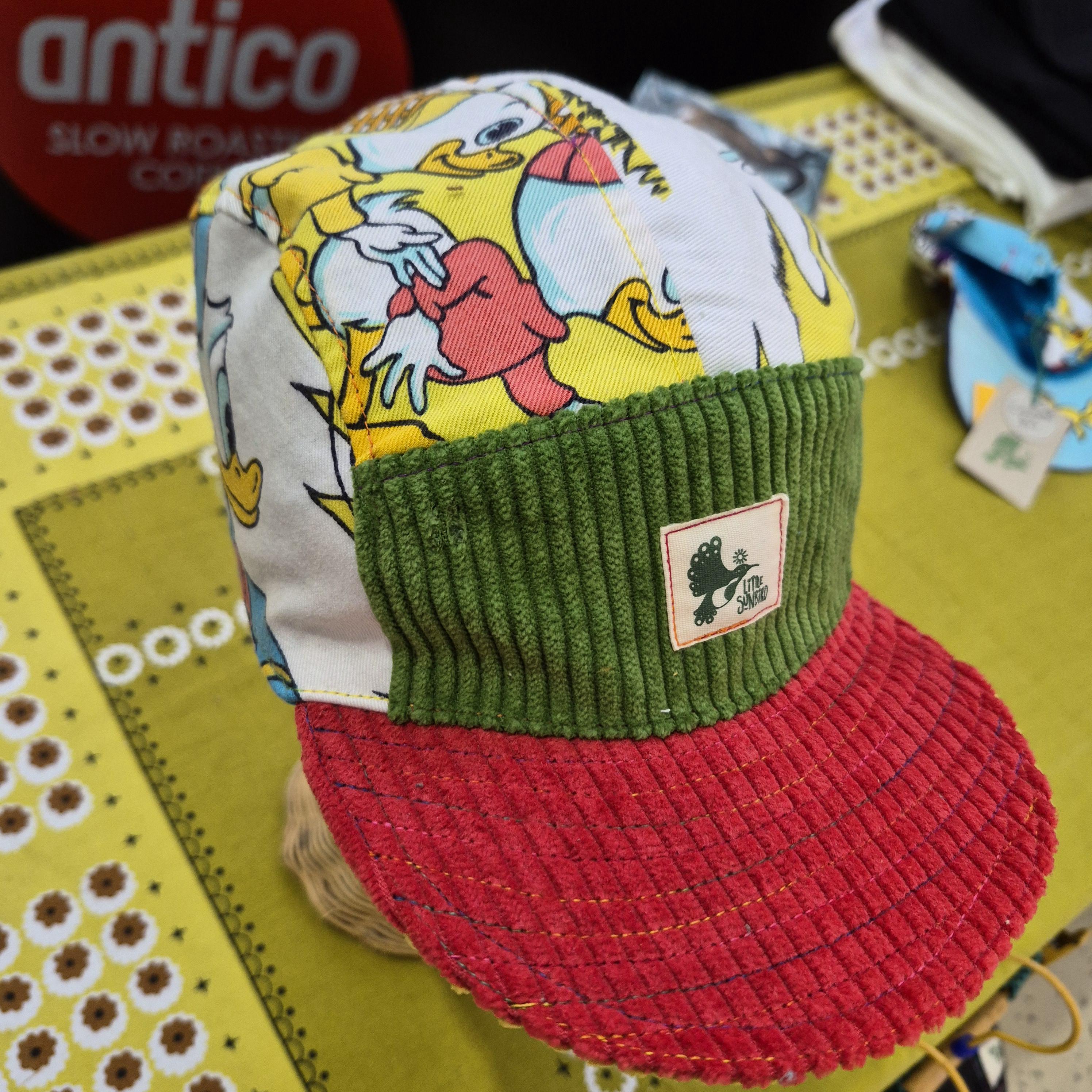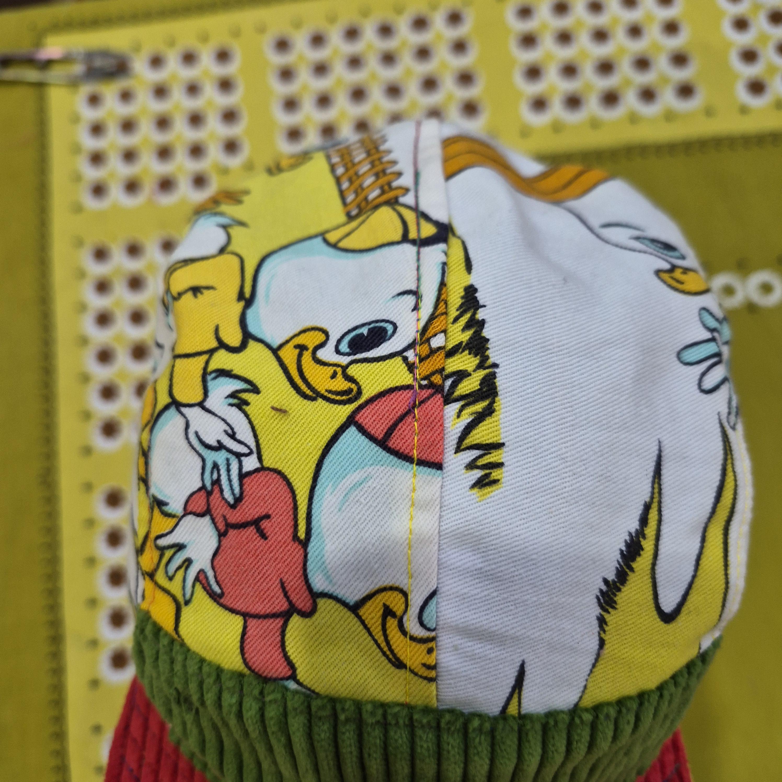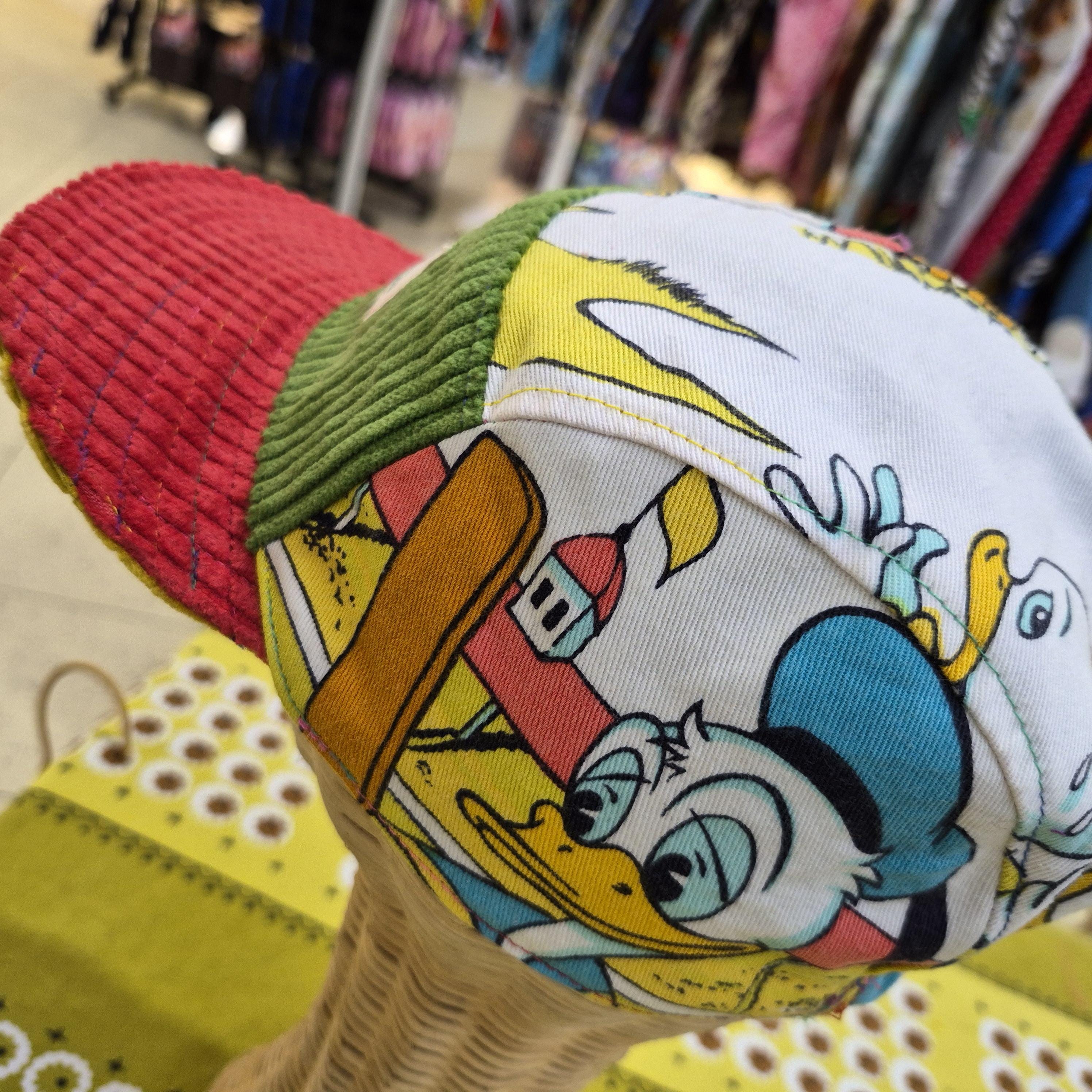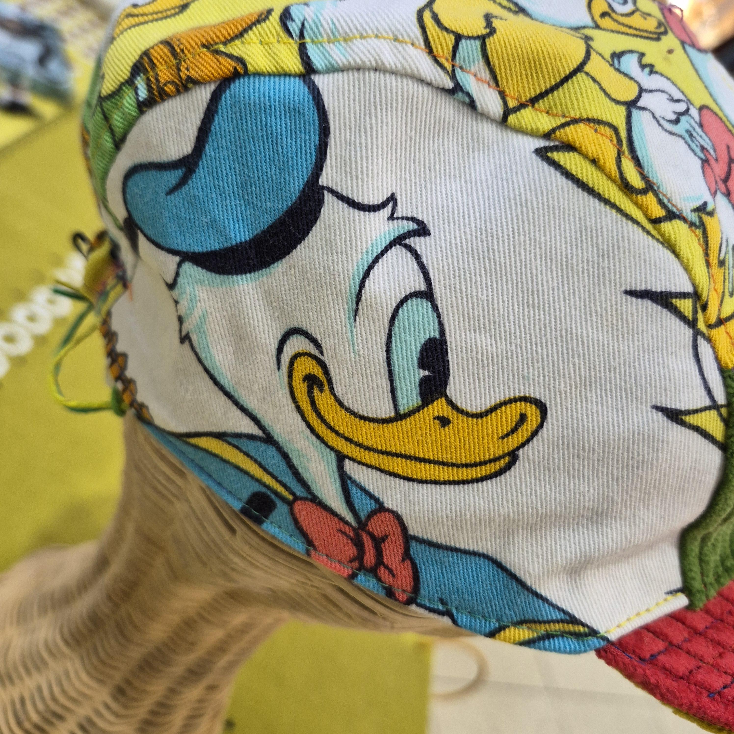 We would be delighted to offer a unique, handmade hat for your consideration. This charming piece is crafted from a beautiful vintage gummerson screen printed donald duck cotton, offering a distinctive texture and appeal. It is designed to fit a range of sizes, from 49cm to 55cm, with an elasticated band for comfortable wear. This versatile size makes it suitable for either a large child or tween. We believe it would be a delightful addition to any collection.